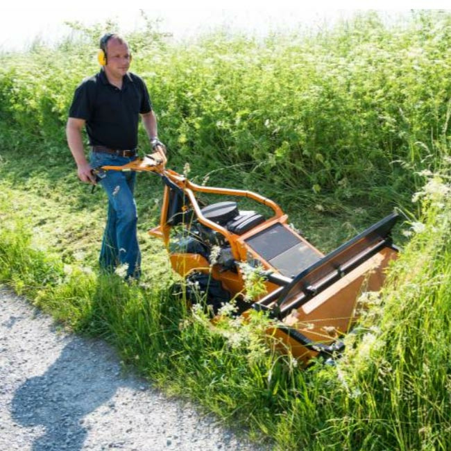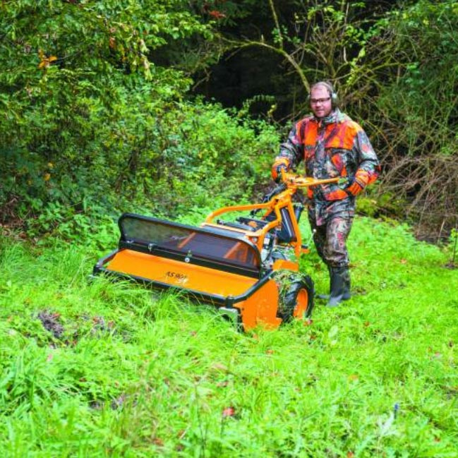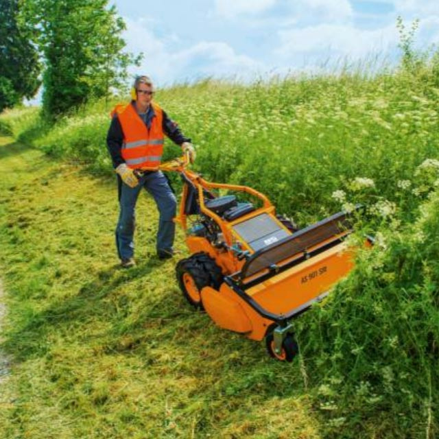 Der Profi-Schlegelmulcher mit großer Flächenleistung und einer sicheren Bedienung in allen Einsatzgebieten Hohe Flächenleistung und perfektes Handling sprechen für den AS 901 SM. Egal ob am Hang, im Gestrüpp oder in hohem Gras, der Schlegelmulcher AS 901 SM mäht fast alles und nahezu überall. Für alle Einsätze am Hang ist der verbaute 2-Zylinder Briggs & Stratton Vanguard Motor mit 16,0 PS und Öl- und Benzinpumpe optimal. Er bietet volle Hangtauglichkeit bei enormer Kraft und Leistung. Für den Fahrantrieb steht ein mechanisches Schaltgetriebe zur Verfügung. Dieses ermöglicht Geschwindigkeiten von 1,2 km/h bis 4,0 km/h vorwärts und 1,8 km/h rückwärts. Das Hinterraddifferenzial ist permanent gesperrt, um optimales Handling am Hang und starke Traktion auch unter feuchten Bedingungen zu garantieren. Zudem ist der AS 901 SM serienmäßig mit Doppelbereifung ausgestattet für mehr Traktion und Stabilität am Hang. Die beeindruckende Leistungsfähigkeit am Hang resultiert aus dem niedrigen Schwerpunkt, dem geringen Gewicht von nur 215 kg sowie der ausgeglichenen Gewichtsverteilung. Einfachste Bedienung mit ausgeklügeltem Sicherheitskonzept Der AS 901 SM wird komfortabel über nur vier Bedienhebel gesteuert. Der Fahrantriebshebel ist mit zwei Funktionen belegt. Er rückt nicht nur den Fahrantrieb ein, er betätigt zusätzlich die Parkbremse. Wird der Fahrantriebshebel losgelassen, so rückt automatisch die Parkbremse ein und der Schlegelmulcher bleibt stehen, in der Ebene und am Hang. Die weitere Bedienung des AS 901 SM erfolgt über die patentierte Lenk-Brems-Kupplung. So lassen sich die beiden einzelnen Räder unabhängig per Bedienhebel steuern. Bei eingerücktem Fahrantrieb ist das Differenzial der Hinterachse permanent gesperrt. Wird der Bedienhebel der Lenk-Brems-Kupplung leicht betätigt, wird die Differenzialsperre geöffnet und der Schlegelmulcher ist frei beweglich. Bei kompletter Betätigung des jeweiligen Bedienhebels wird das dementsprechende Rad gebremst. Dadurch lässt sich der AS 901 SM komfortabel, präzise und vor allem sicher steuern und bedienen. Edelstahl-Bowdenzüge garantieren dauerhaft geringe Bedienkräfte. Das robuste Schlegelmähwerk des AS 901 SM - ideal für harte Einsätze Mit dem 90 cm breiten Schlegelmähwerk, ausgestattet mit 26 Y-Schlegelpaaren, sind Flächenleistungen bis 3.600 m² pro Stunde möglich. Grashöhen bis 130 cm und dichtes Gestrüpp sind für den AS 901 SM kein Problem. Für unebenes Gelände ist das Schlegelmähwerk pendelnd gelagert und passt sich so Bodenunebenheiten an. Die Schnitthöheneinstellung erfolgt zentral und in sechs Stufen von 10 – 100 mm. Die Y-Schlegel schneiden und zerkleinern das Schnittgut zugleich. Durch starke Zerkleinerung des Mähguts und die gleichmäßige Ablage des Schnittguts auf voller Mähbreite wird ein optisch hervorragendes Mähbild erzielt. Die Y-Schlegel sind pendelnd gelagert und können so Hindernissen ausweichen. So werden sie vor Beschädigungen geschützt. Geschützt wird ebenso der Bediener. Der Steinschlagschutz aus stabilem Lochblech schirmt den Bediener vor aufgewirbelten Fremdkörper ab, ohne die Sicht zu behindern. Durch den höhen- und seitenverstellbaren Bedienholm lässt sich der Holm dem Bediener und den Einsatzgegebenheiten anpassen. Somit wird das Arbeiten mit dem AS 901 SM noch komfortabler. Produktvorteile Steilhangtauglich Volle Hangtauglichkeit durch extra Benzin- und Ölpumpe mit Öldruckschalter. Robustes Schlegelmähwerk (AS 901) Pendelnd gelagertes Schlegelmähwerk mit 26 Y-Schlegelpaaren für ein sehr sauberes Mulchergebnis bei hoher Flächenleistung. Automatische Parkbremse Beim Loslassen des Fahrantriebshebels stoppt die Maschine automatisch, egal ob am Hang oder auf der Ebene. Lenk- und Bremskupplung Manövrieren leicht gemacht: Mit der Einzelradbremse lässt sich das Gerät exakt und mühelos steuern. Permanente Differenzialsperre Die Differenzialsperre ist permanent gesperrt und öffnet nur beim Lenken mit der Lenk- und Bremskupplung. Leicht und ausbalanciert Stabiler Leichtbau mit doppelwandiger Mähhaube und steifem Vierkantrahmen. Tiefer, mittiger Schwerpunkt für optimale Hangtauglichkeit. Wurfkörperprüfung (AS 901) Geprüft nach DIN EN 12733:2011-06. Technische Daten Schnittbreite 90 cm Maximale Grashöhe 130 cm Motorhersteller Vanguard Motorbezeichnung V-Twin 4T Motor, 2-Zyl. Hubraum 480 cm³ Maximalleistung 11,9/16,0 kW/PS Nennleistung 10,7/14,5 kW/PS Nenndrehzahl 3500 U/min. Startvorrichtung manuell Antrieb mechanisch Anzahl Gänge 5 Rückwärtsgang ja Max. Geschwindigkeit 4 km/h Automatische Parkbremse ja Differentialsperre ja Messerkupplung mechanisch / Geschlossene Mähhaube ja Schlegelpaare 26 Schlegelform Y Schnitthöhe 10 - 100 mm Beidseitig verwendbare Schlegel ja Tankinhalt 5 Liter Abmaße LxBxH220x104x105 cm Gewicht 215 kg