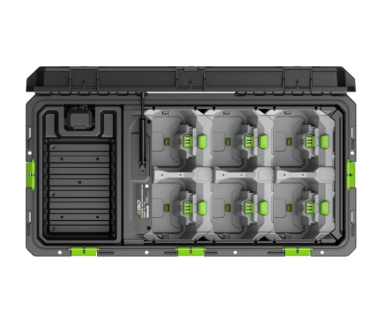 Der Multi-Port-Ladekoffer funktioniert mit einem intelligenten Strommanagementsystem, das die Akkus mit dem geringsten Ladezustand erkennt. Es lädt diese zuerst auf, bis sie den Ladezustand der anderen Akkus erreicht haben. Dann erst beginnt das Aufladen aller Akkus gleichzeitig, bis sie voll sind. Mit dem Multi-Port-Ladekoffer können sechs 10-Ah-Akkus in nur drei Stunden vollgeladen werden. Laden Sie bis zu sechs 56-V-ARC-Lithium-Akkus gleichzeitig mit Ihrem Multi-Port-Ladekoffer auf. Kann direkt mit dem CHV1600E Multi-Port-Ladekoffer aus der Professional-Serie oder mit dem 550-W- Schnellladegerät, beide von EGO, genutzt werden, wenn es mit dem ACA1000 Ladeadapter kombiniert wird.Im Ladekoffer selbst ist Platz für die sechs Akkus und für einen zusätzlichen Stauraum. Der Scharnierdeckel bietet Witterungsschutz. Sie brauchen sich also keine Sorgen zu machen, wenn Sie in einen Regenschauer geraten. Weil Ihr Ladekoffer Rädchen hat, macht die Mitnahme keine Mühe.Die Ladezeit mit dem CHV1600E für sechs 10-Ah-Akkus beträgt schätzungsweise 3 Stunden. Wird das 550-W-Schnellladegerät und der Ladeadapter mit Koffer verwendet, dauert es etwa 8 Stunden.Es spielt keine Rolle, wie hoch der Ladezustand der einzelnen Batterien ist. Das intelligente Energiemanagementsystem lädt zuerst die Akkus mit der niedrigsten Ladestufe auf und bringt dann alle Akkus mit der gleichen Geschwindigkeit auf den vollen Ladezustand. AUSGANGSSPANNUNG 56 V ANZAHL DER AKKU-ANSCHLÜSSE 6 CHARGING TIME 10,0AH BATTERY (MINS) 180 min CHARGING TIME 12,0AH BATTERY (MINS) 210 min BLE-ANSCHLUSS Nein WIFI-VERBINDUNG Nein MAX. LÄNGE DES LADEGERÄTS (MM) 889 MAX. BREITE DES LADEGERÄTS (MM) 452 MAX. HÖHE DES LADEGERÄTS (MM) 349