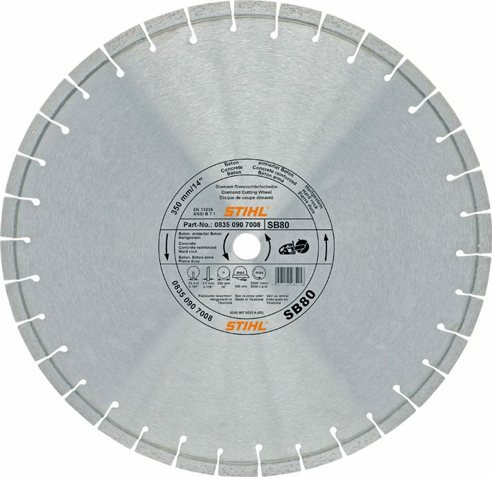 Diamant-Trennscheibe, Ø 350 mm SB 90Sehr schnelle Universal-Trennscheibe für Ziegel, Beton, Klinker, Granit und duktiles Gussrohr. Extrem robuste und temperaturbeständige Materialzusammensetzung. Daher für Trennarbeiten an bis zu 10 mm dickem Baustahl und für Aufräumarbeiten im Katastrophenschutz geeignet.