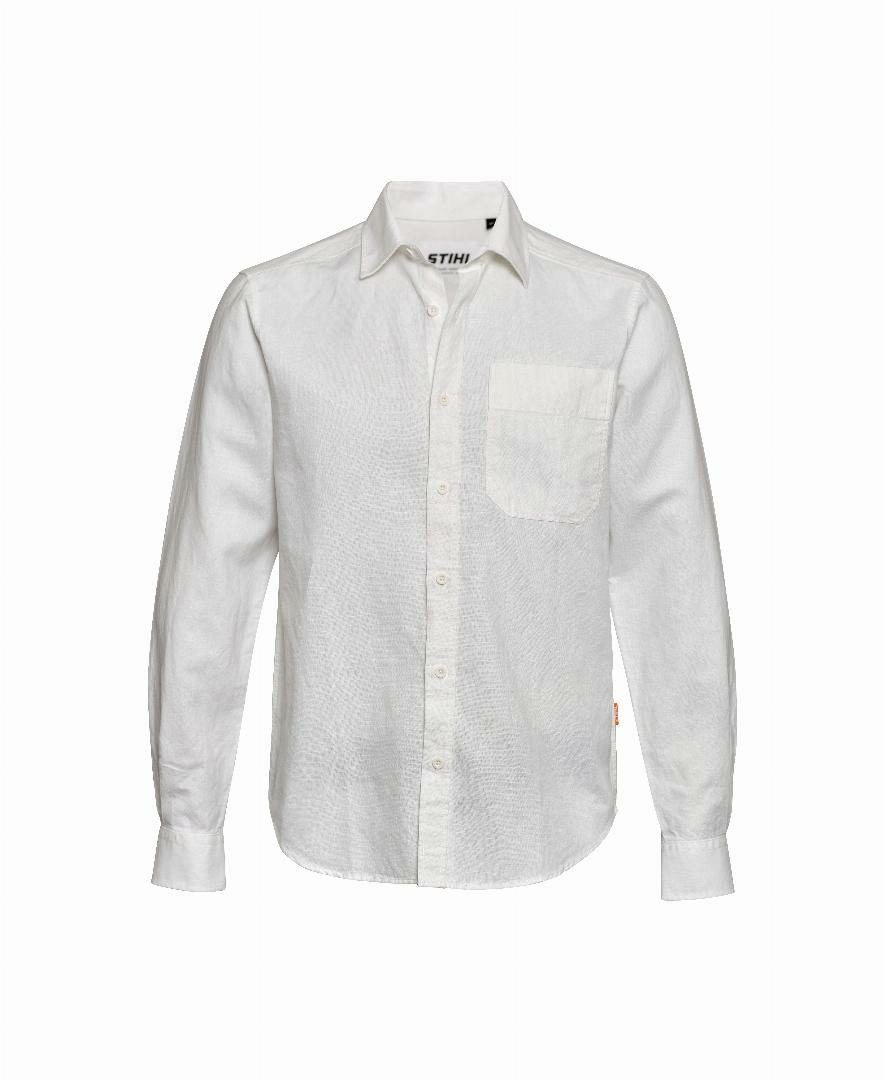 Hemd Gr. L LINEN WeißMacht so einiges mit und sieht dabei immer gut aus: das luftige Hemd aus Leinen-Baumwollmischung in Weiß bei der Arbeit und in der Freizeit. Mit einer aufgesetzten Brusttasche, abgesetzter Knopfleiste und STIHL Flag Label an der Seite.