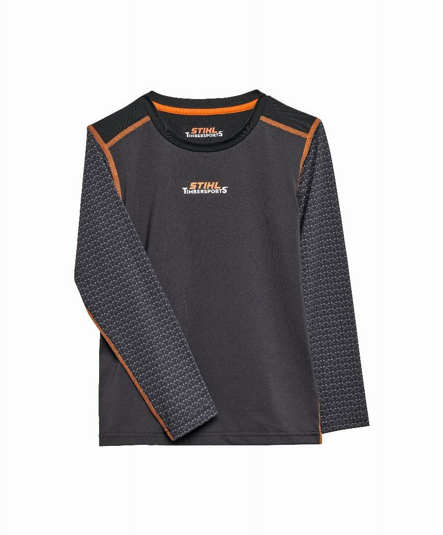Langarmshirt Gr. 110-116 KIDS TIMBERSPORTS®Ab in den Wald! Am besten in diesem Funktionsshirt für Kinder. Das Shirt ist im Colour Block Stil in Schwarz und Dunkelgrau gestaltet. Auf der Brust prangt ein TIMBERSPORTS ® Logo in den Originalfarben. Die Ärmel sind mit kleinen gedruckten Äxten verziert. Die Nähte sind in STIHL Orange abgehoben.