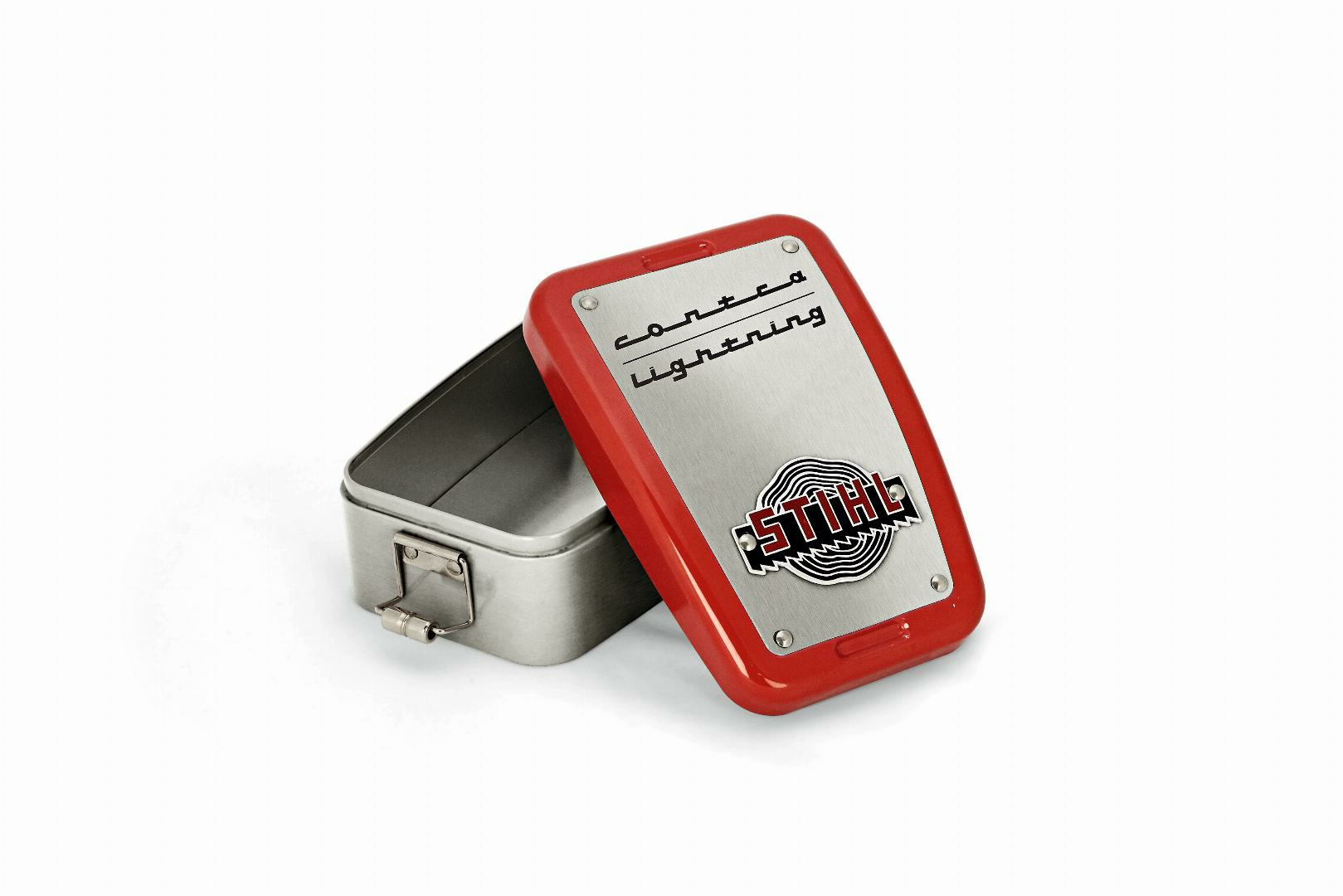 Universalbox „CONTRA“Metalldose, Größe 181 x 123 x 60 mm, mit STIHL Logo und Prägung.